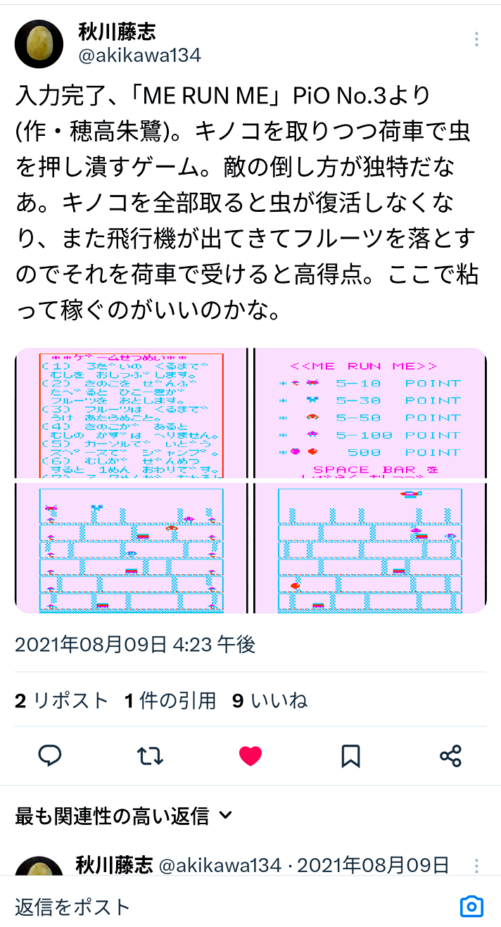 | <MERUN ME>発見! 秋川さん(秋川藤志@akikawa134)は、私が40年くらい前に作った、PC-6001(mkⅡ)のゲームを、雑誌のだ脳リストからの打ちこみで、何作かを復元してくださっている大恩人。 秋川氏のお陰で、私が開発者なのに持っていない自分のゲームが、いくつも動くところが動画で観れた。 また、そのため、『パックスソフトニカ小切手事件』で、精神に壊滅的打撃を受けた、私自身のゲーム開発者としてのアイデンティティも復活できた部分がある。 本当に、感謝しかない。 秋川さん、本当にありがとうございます。 その秋山さんが、2021年8月9日に、商品化されていない…すっかり忘れていたが、何かの縁で私自身が雑誌に投稿していた『ME RUN ME』というPC-6001のゲームも、売り込みで復活させてくださっていたのを、先日、たまたま発見!した。 「う~む…。こんなことがあるんだなぁ」 というのが、私の驚きの感想。 この『ME RUN ME』というゲームをすっかり忘れていたので、検索もしなかった、ということなのだ。 ふむむ…。 このキャラクター。 『穂高朱鷺』という開発者名。 雑誌に寄稿した、癖のある文章。 わ、た、し、だ! 40年も前(1983年?)に作ったけど、製品化されず、なぜか雑誌の投稿が残っていて、それが打ち込みで再現されるとはねぇ。 この歳になって、自分のゲームと文章に出会えるなんて…。 あの頃、寝ないでゲームを作っていたからなぁ。 よく作っておいてくれた! ありがと~! あのときの、オレ! なんかの番組の、『自分自身へのビデオレター』みたい。 ------------------------------------------ 以下は、私のXの文章。 ↓ こ、これは? 穂高朱鷺! 私!?😳😳 秋川さんは『それいけくるくる』などを打ち込みで復活していただいてる大恩人。Xでも感謝投稿したこともある。 ただ、この『ME RUN ME』は覚えていない。 今年、一時的にゲーム界に復帰し昔を振り返り色々書いたけど⋯。 確かに、私の作りそうなキャラクター⋯。 |